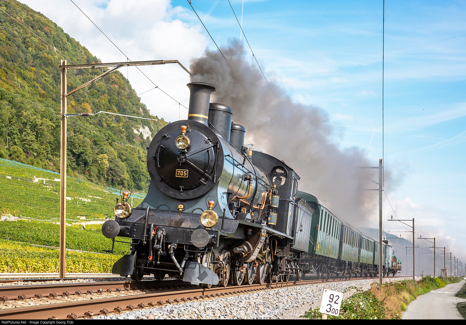 Express train steamlocomotive A 3/5 # 705 of SBB Historic with an (empty) passenger train from Brugg (AG) to St.Maurice. The cars are C2 # 5906 of association Historische Eisenbahn Gesellschaft (HEG) from Delémont, C2 # 6138, C3 # 8395, baggage F3 # 18275, tools car K2 # 38405 and coal transport car X # 40 85 95-27 100-3 from SBB Historic. This was a transfer run to the western part of Switzerland for the russian movie project "Sunstroke" (released in 2014) in the Lake Geneva region (Bouveret). Nowadays, the fourcylinder compound A 3/5 # 705 (SLM 1904) is maintained and operated by the steam group Zürich and based in Brugg AG, but undergoing a large rebuilding in the moment.