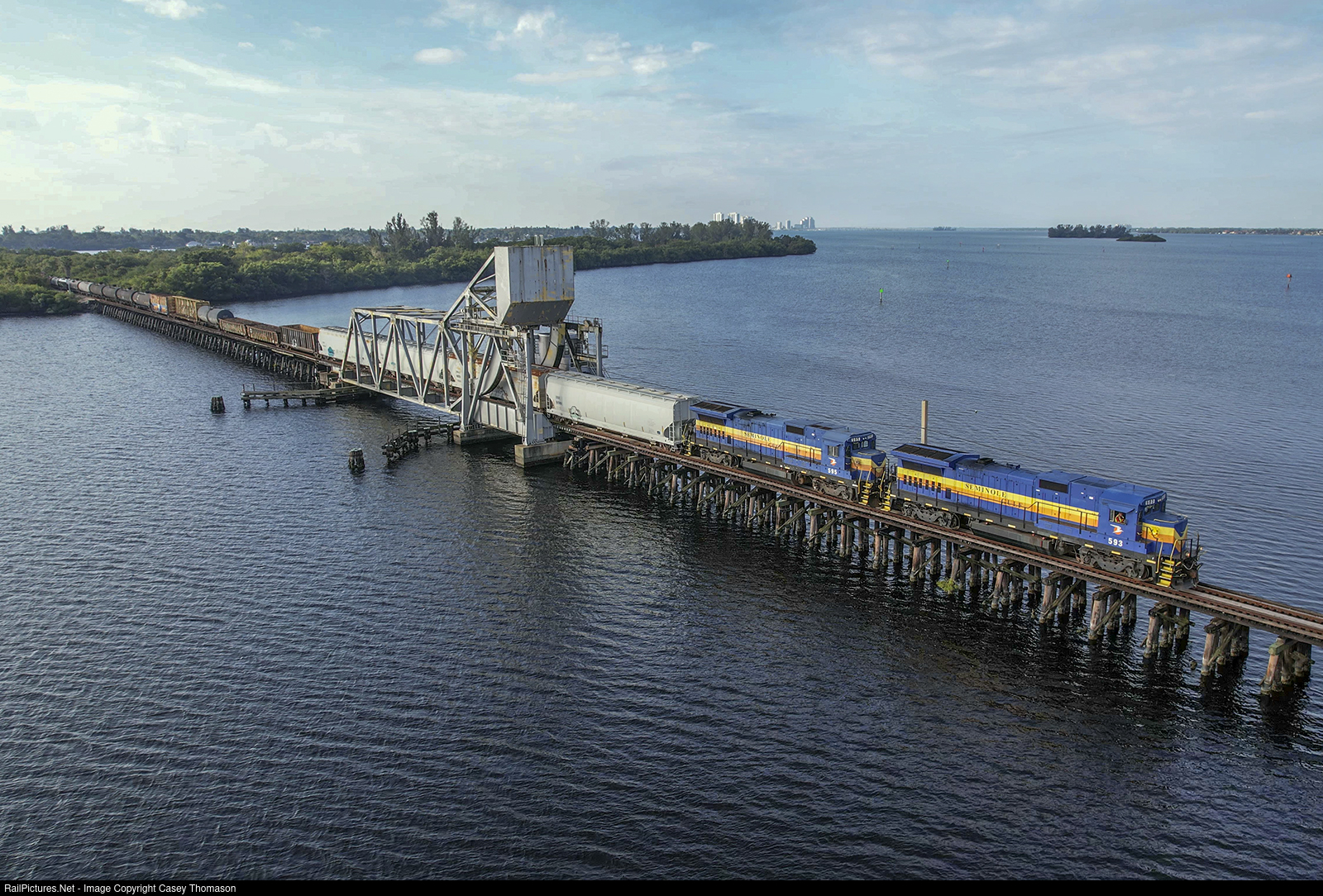 | A pair of former LMX B39-8's leads the Seminole Gulf's northbound Arcadia Turn across the Caloosahatchee River in Tice, Florida. The skyline seen in the distance is downtown Fort Myers. |