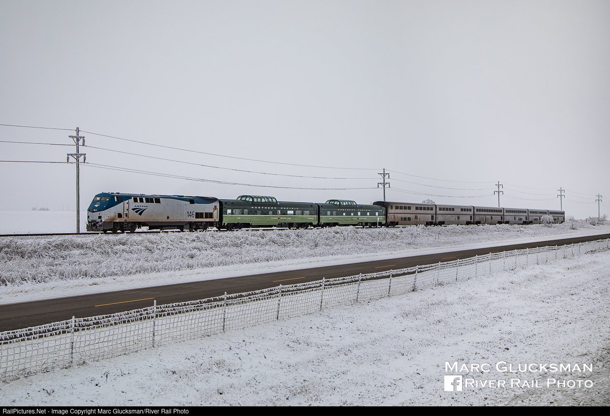 Cold In Chenoa. Amtrak Train 22 (Texas Eagle) was keeping good time as it rolled through Chenoa, Illinois on January 4, 2021 with Amtrak 146 (P42DC) leading Webb Rail's former Northern Pacific Railway Budd built Pullman dome/sleeper 313 (WEBX 801044) and former Northern Pacific Railway Budd built dome/coach 549 (WEBX 801045). This was quite a temperature change for those riding from San Antonio, Texas, who had been in short sleeves when the trip started. More on the Webb Rail fleet at www.webbrail.com