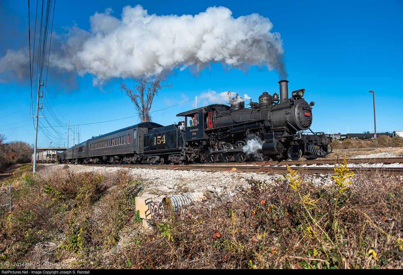 | The Christmas Lantern Express departs for the second run of the day as Southern 154 does the honors of leading the eastbound trip up the grade by the athletic parks for the University of Tennessee. |