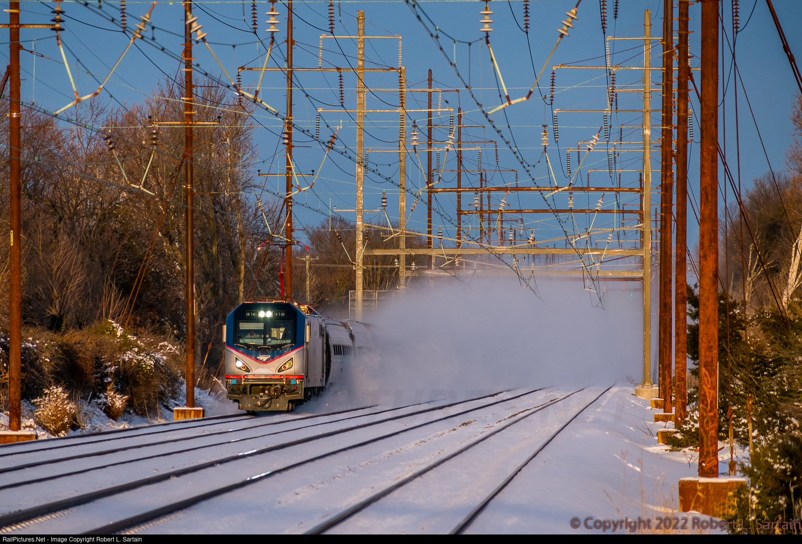 | Amtrak Northeast Regional train 87 kicks up a rooster tail of snow running south to Washington Union Station. Despite the winter weather, the train is only three minutes off the advertised. |