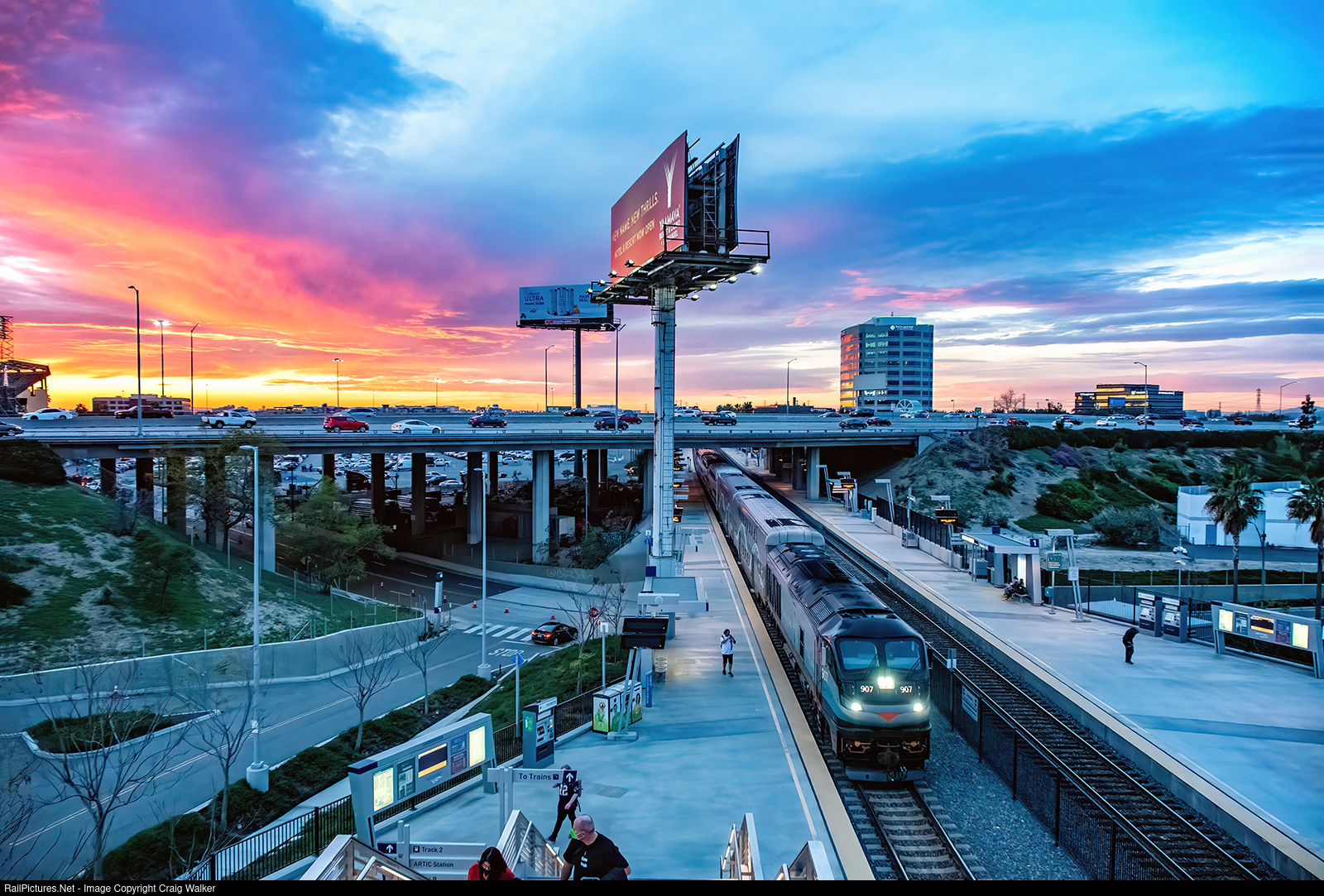 Heading west as my wife and I were taking our walk this evening, we could see that a nice sunset was developing. Once home, I grabbed my camera and headed out the door, which was no surprise to my wife, of course, and headed the three miles to the Anaheim Regional Transportation Intermodal Center to catch a Los Angeles-bound Amtrak Pacific Surfliner, as it would make a nice photo. Unfortunately, my drive took 8 minutes, and the train beat me to the ARTIC by two minutes. And the sunset had turned into a spectacular one! So, I waited about ten minutes, hoping the sunset would last that long in the quickly fading winter light, for a southbound Metrolink commuter train heading to Oceanside. And luck was apparently on my side and the blazing oranges, yellows and reds in the western sky held up (and were, for the most part, not visible to the crowd in the adjacent Angel Stadium, just barely visible on the left … But tonight’s event was a motocross race, so I doubt many in the crowd would have appreciated this colorful dusk) as Metrolink F125 907 pulled train 668 under the Orange Freeway (CA-57) and into the station. But I certainly appreciated the light show occurring in the western sky! (Anaheim, California – January 29, 2022)