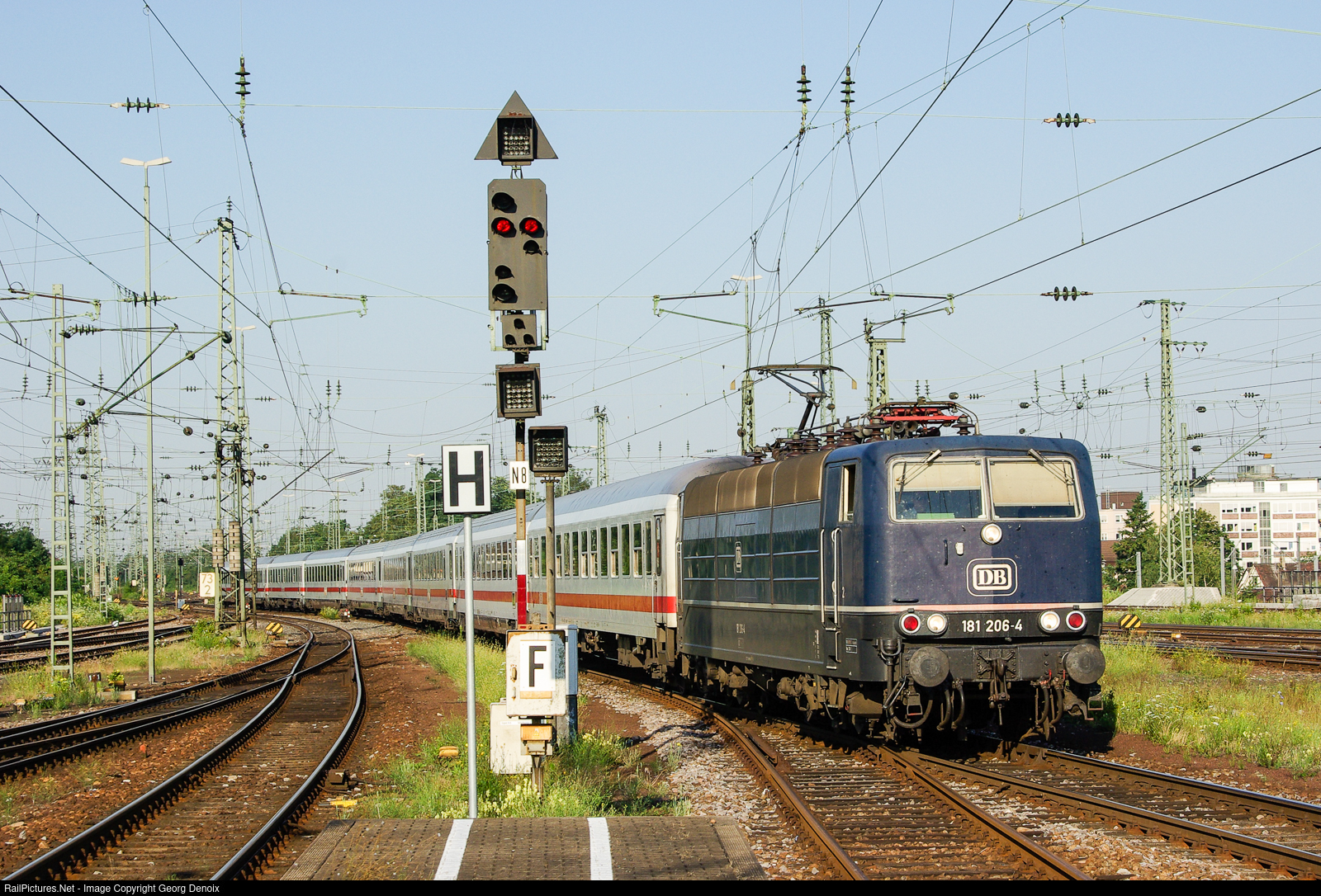 181 206 kept her original 1970s blue Deutsche Bundesbahn livery and logos as designated heritage unit and is seen here passing the exit signal of the adjacent platform on the west end of Karlsruhe Hauptbahnhof (Hbf).