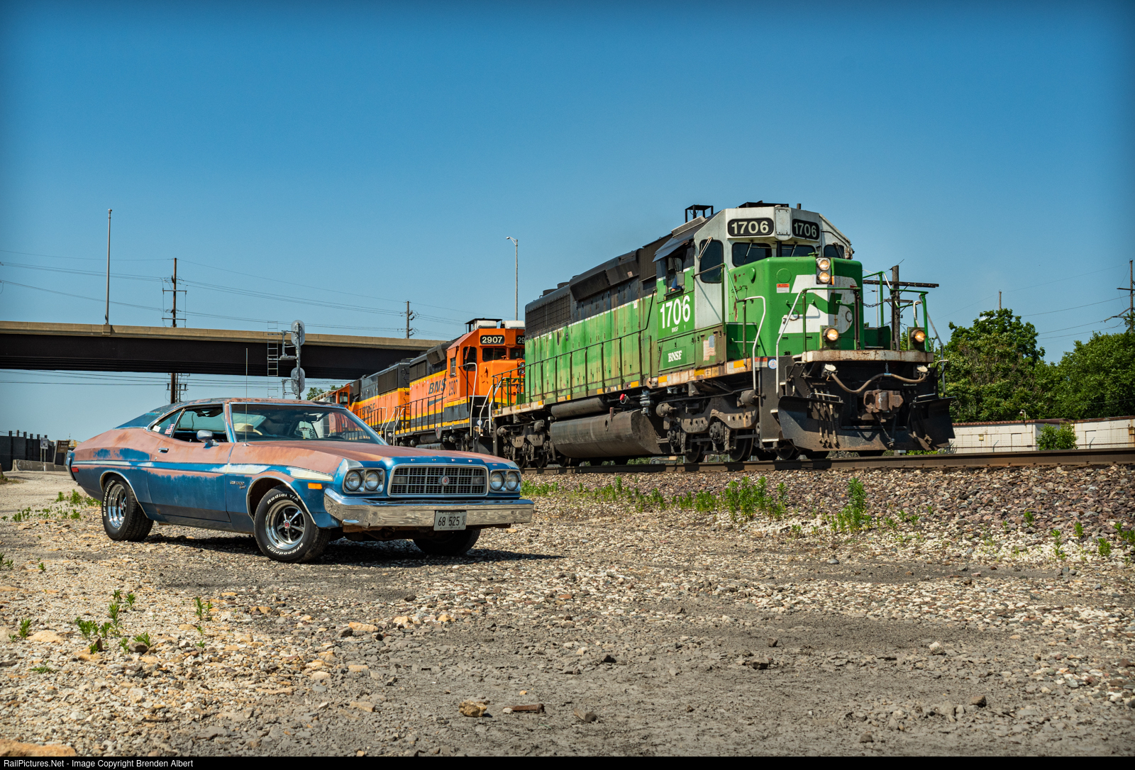 Former BN SD40-2 #1706, a 1973 product of EMD, and a 1973-built Ford Gran Torino meet in the industrial mayhem of Romeoville, Illinois along the old Santa Fe mainline. As is apparent, both machines have been beaten to hell and back and it really demonstrates just how far we're drifting from the Disco Decade. Shoutout to my buddy Nick for driving out to pose his car for this train. It was a pretty interesting reunion, to say the least!