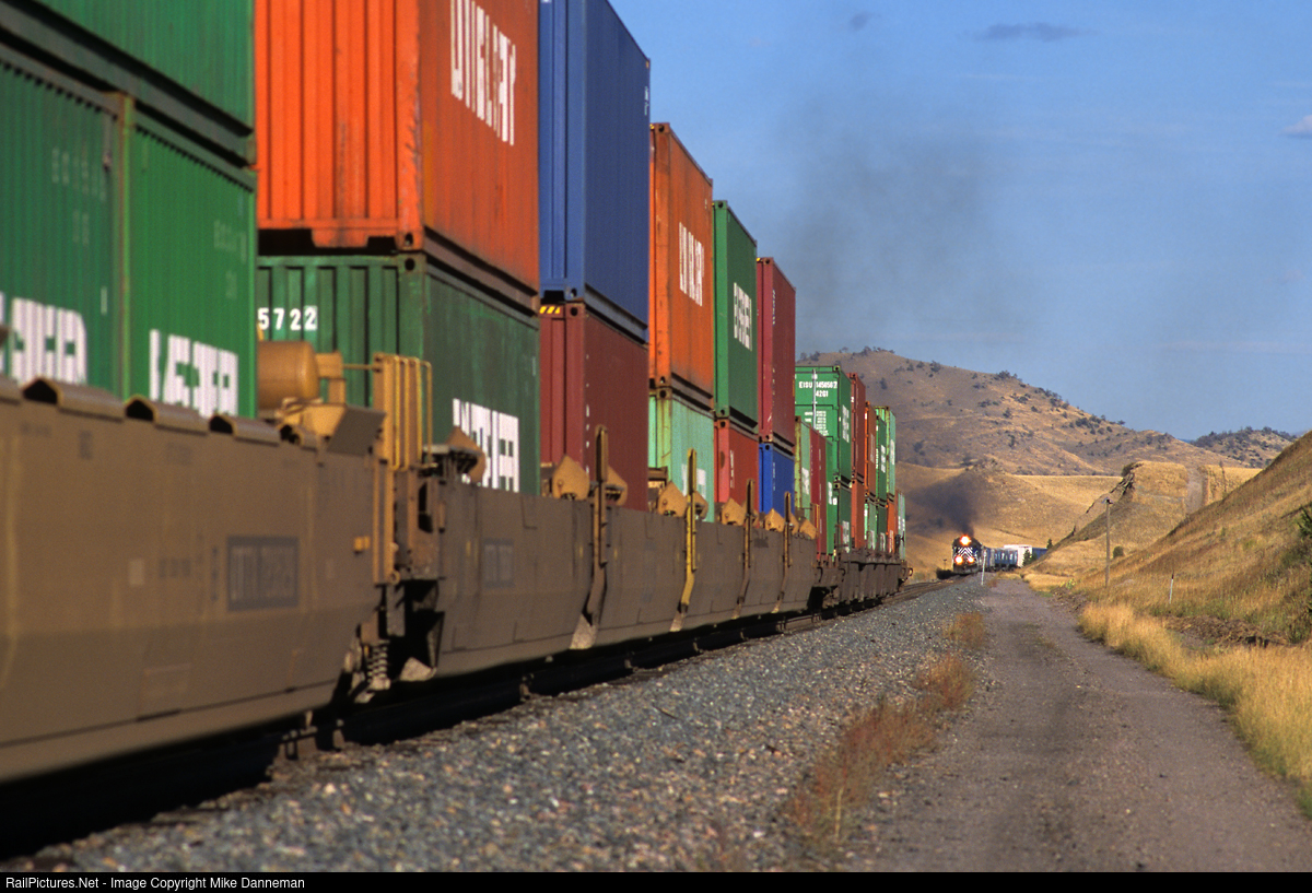 A Burlington Northern Santa Fe Q train trundles by as it climbs Bozeman Pass, and with only two locomotive pulling it, MRL’s LM (Laurel to Missoula freight) has caught up to it on red signals and obediently follows close behind up the nearly two percent grade at Hoppers, Montana, on September 23, 2002.