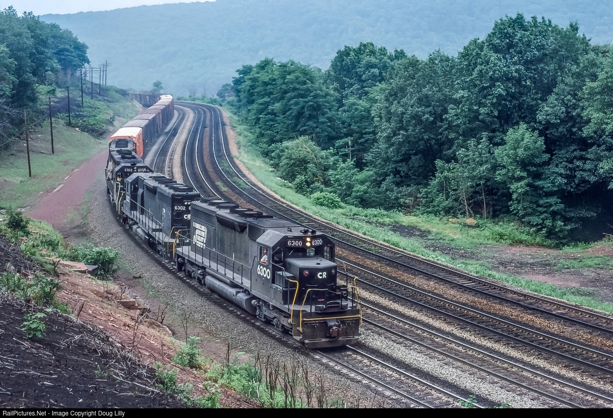 | With engineers visible in the lead and third units, two SD40 head-end helpers and a pair of SD45’s pull a westbound Conrail train out of Altoona, Pennsylvania, about a mile east of Horseshoe Curve. It’s strange to think that one of the busiest railroads in the world had deteriorated to the point of having grass growing between its rails. Infusion of cash into the infrastructure would transform the railroad over the next few years. |