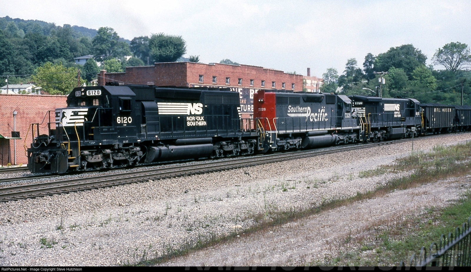 | Former N&W SD40-2 6120, Southern Pacific SD40E 7328 and former N&W GE C30-7, push another loaded coal train toward Bluefield West Virginia. The city of Bluefield sits on the state line between Virginia and West Virginia. |