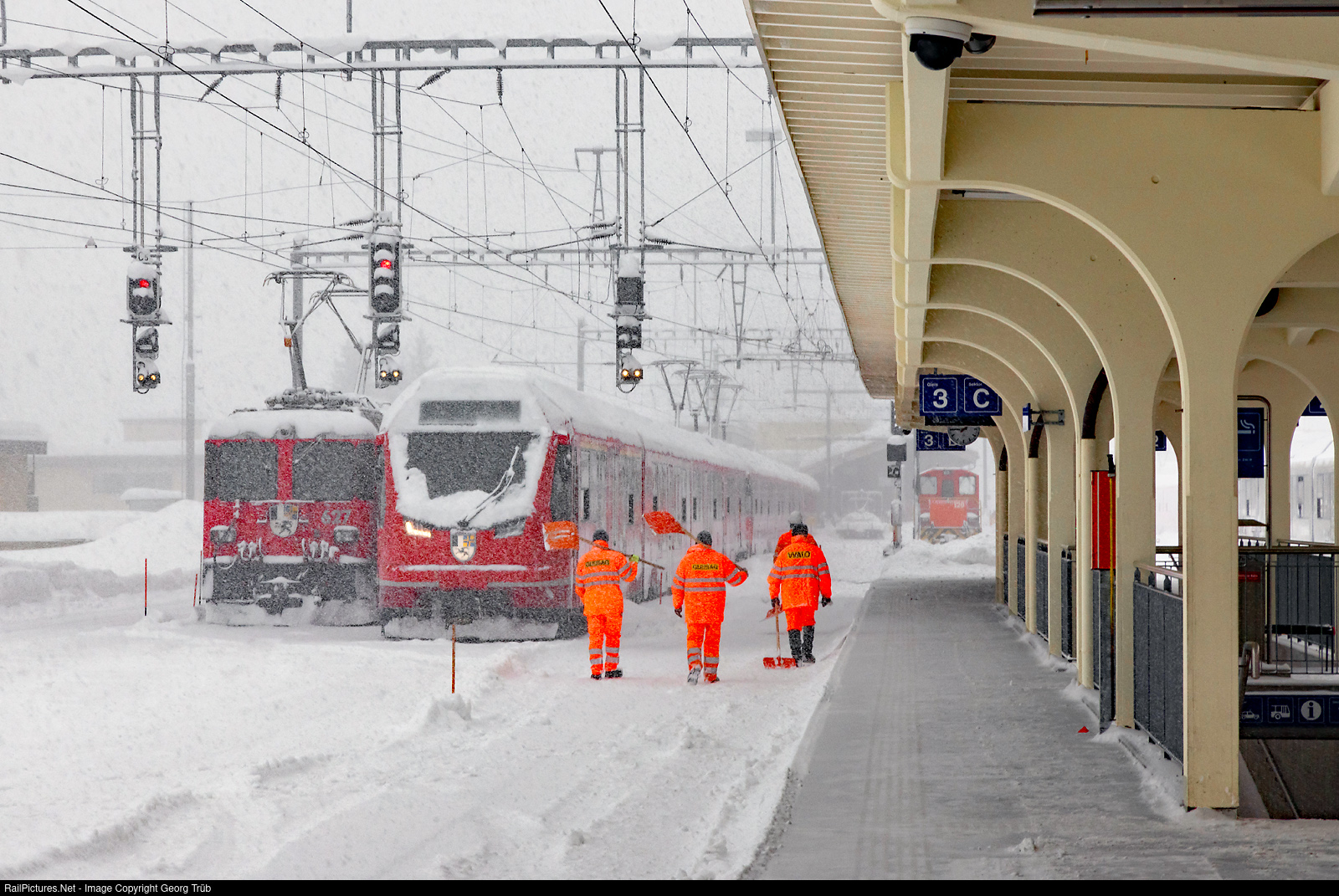 Davos Platz on a real winter day. Stabled Ge 4/4 II # 627 and "Capricorn" ABe 4/16 # 3111. On such days, workers from private companies assist the RhB in clearing the snow (GLEISAG, WALO).