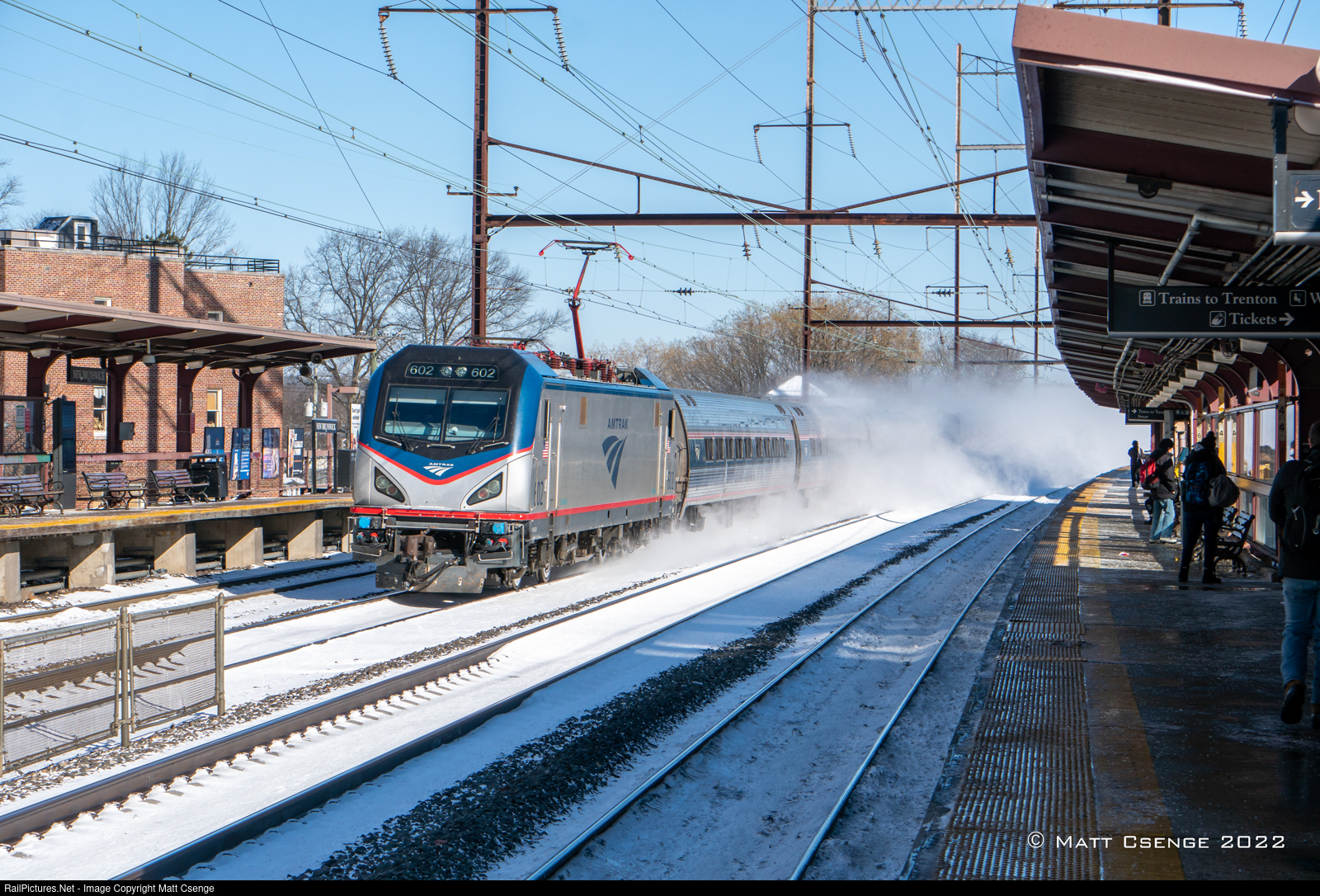 Amtrak 602 is seen racing through New Brunswick Station, about to coat the platforms in powder from the cloud behind it! |