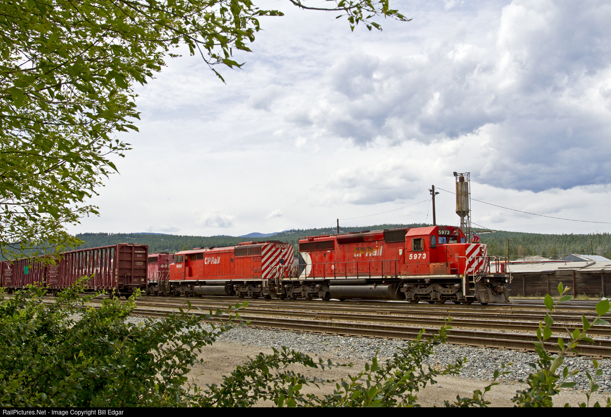 | CP 5973 will head up a vintage trio of GMD power for the Cranbrook to Golden freight which the crew has almost ready for departure from Cranbrook, BC yard. Red Barn 9006 would have sure looked nice if the Pacman or Clamshell logo had been applied to the rear in black & white. Those were the first units delivered without that treatment. |