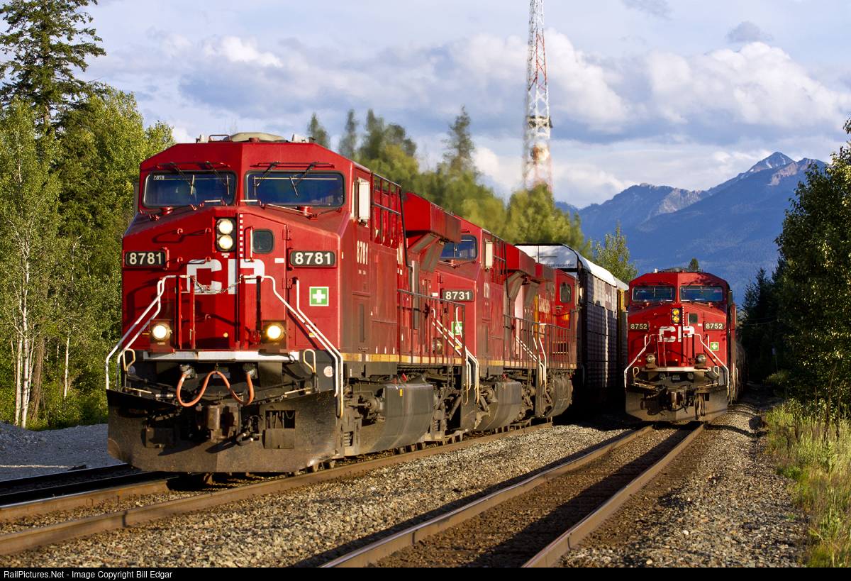 | CP 8781 leads a freight west at Moberly meeting an eastbound train tucked in the siding. The train just left Golden for a climb over Rogers Pass to Revelstoke, BC. CP 8781 was repainted orange in fall 2021 to honor customer Hapag Lloyd & their St. John Express. |