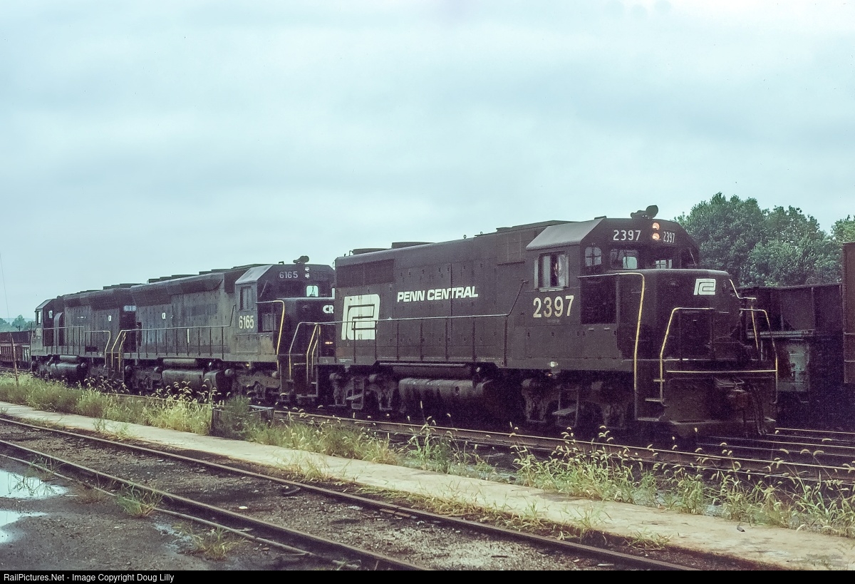 | A Penn Central GP35 leads two Conrail SD45’s through Saucon Yard in Hellertown, Pennsylvania. The non-dynamic-brake-equipped GP35 was built for service on New York Central’s water level route, while the six-axle SD’s spent their initial years traversing the mountains of the Pennsylvania Railroad main line. |