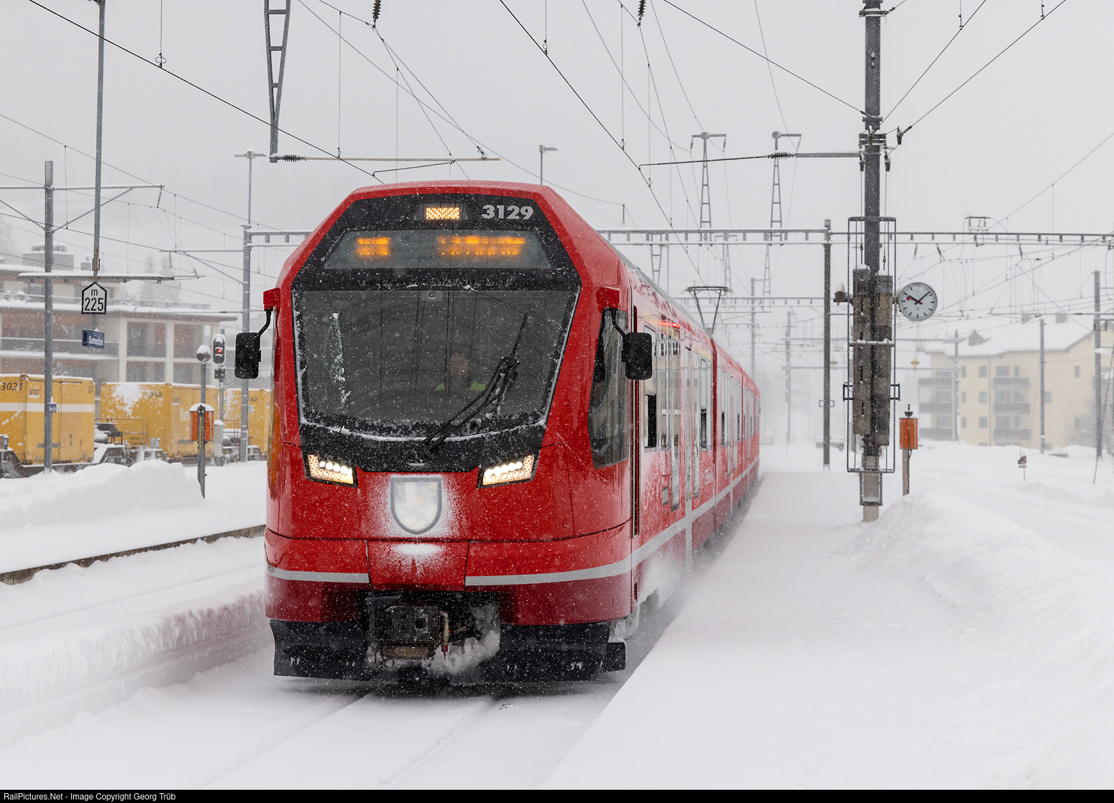 | "Capricorn" ABe 4/16 # 3129 of the Rhaetian Railway is entering Samedan, running as RE 1323 from Landquart via Klosters-Zernez to St.Moritz. |