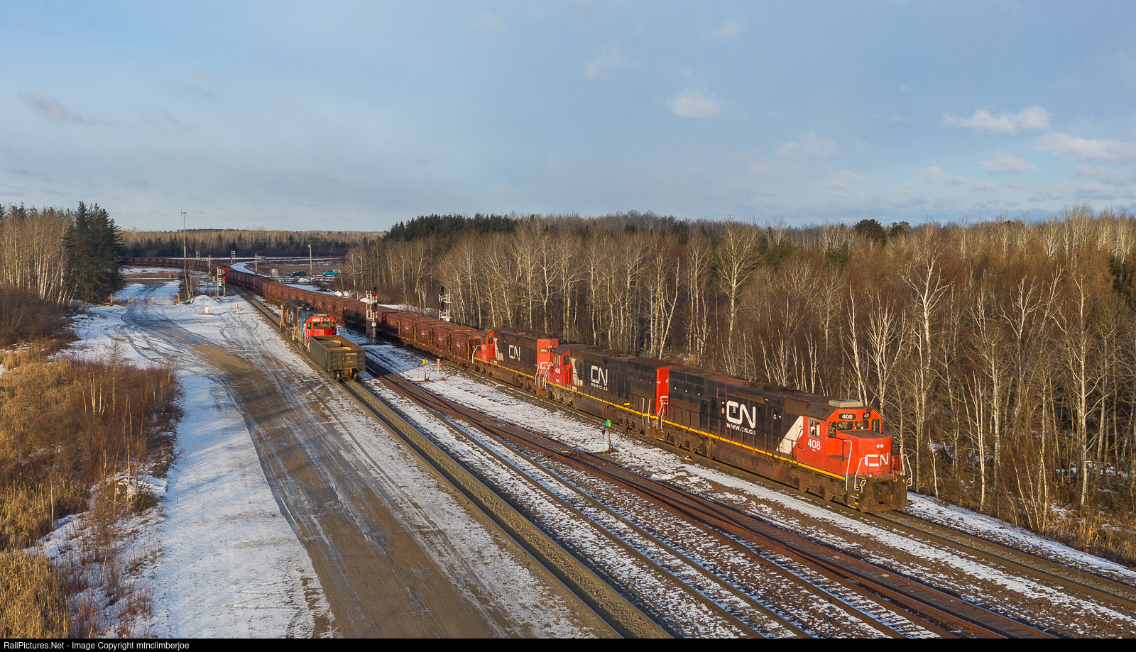 As the morning sun rises in Forbes, Minnesota, a trio of EMD's lead empty ore train U716 as it comes off the main and heads into the loop track for loading at the Fairlane Taconite Plant. The Keenan Local, R901, waits at the signal for the empty train to clear before they can get the light back to Keenan.