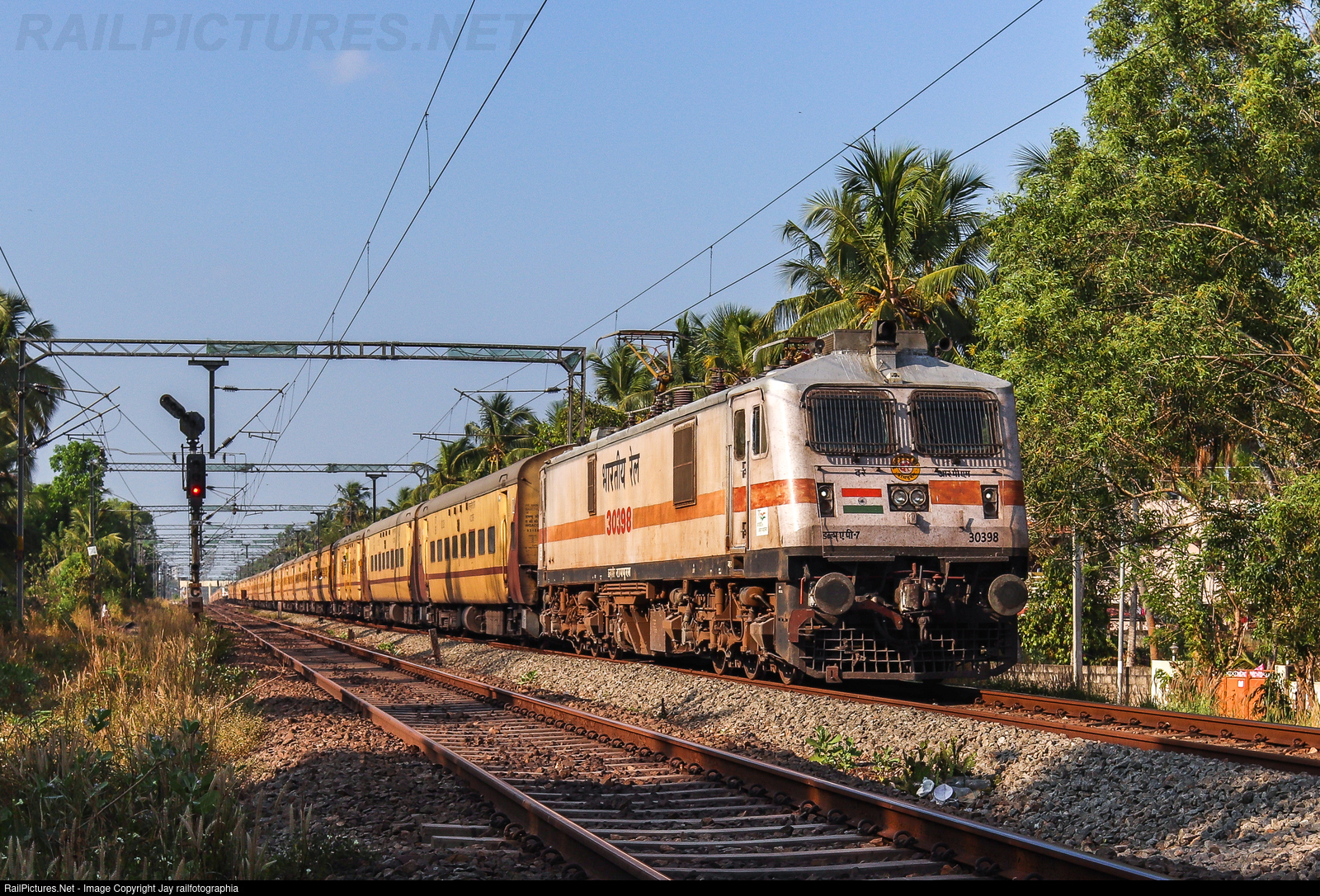 As shadows grow longer and sunset starts, ANANTAPURI Express powered by ROYAPURAM WAP-7 passes through Kazhakootam area