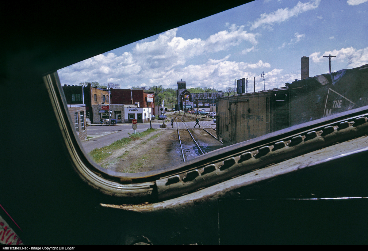 I was fortunate enough to hitch a short ride with the Milwaukee Road crew in F7A 68C while they started putting their train together in Eau Claire. This fireman side view shows the east end of their yard, Barstow St. crossing, a small grain elevator and vintage buildings in the area. The only thing left today is Barstow St. The rest has been torn down or removed and is undergoing redevelopment. No evidence the MILW existed except for their bridge across the Chippewa River (not in view) which is now a walk bridge.
