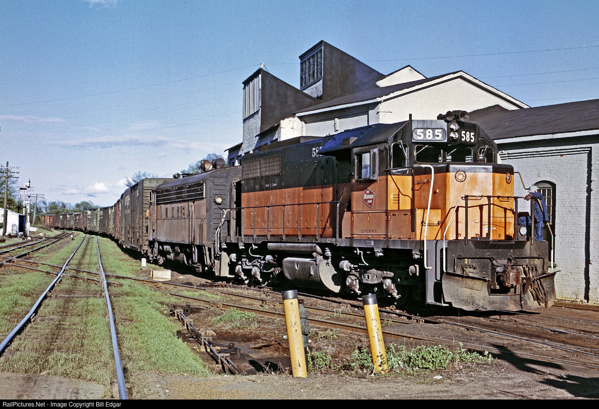 MILW 585 and 68C back their train east from their downtown Eau Claire yard onto C&NW's eastbound main track near Eau Claire tower. Once on C&NW, the train will head west to St. Paul Pig's Eye Yard as a detour. By the later 1970s this had become permanent trackage rights. This replaced their own branchline to Trevino, WI & Winona, MN.