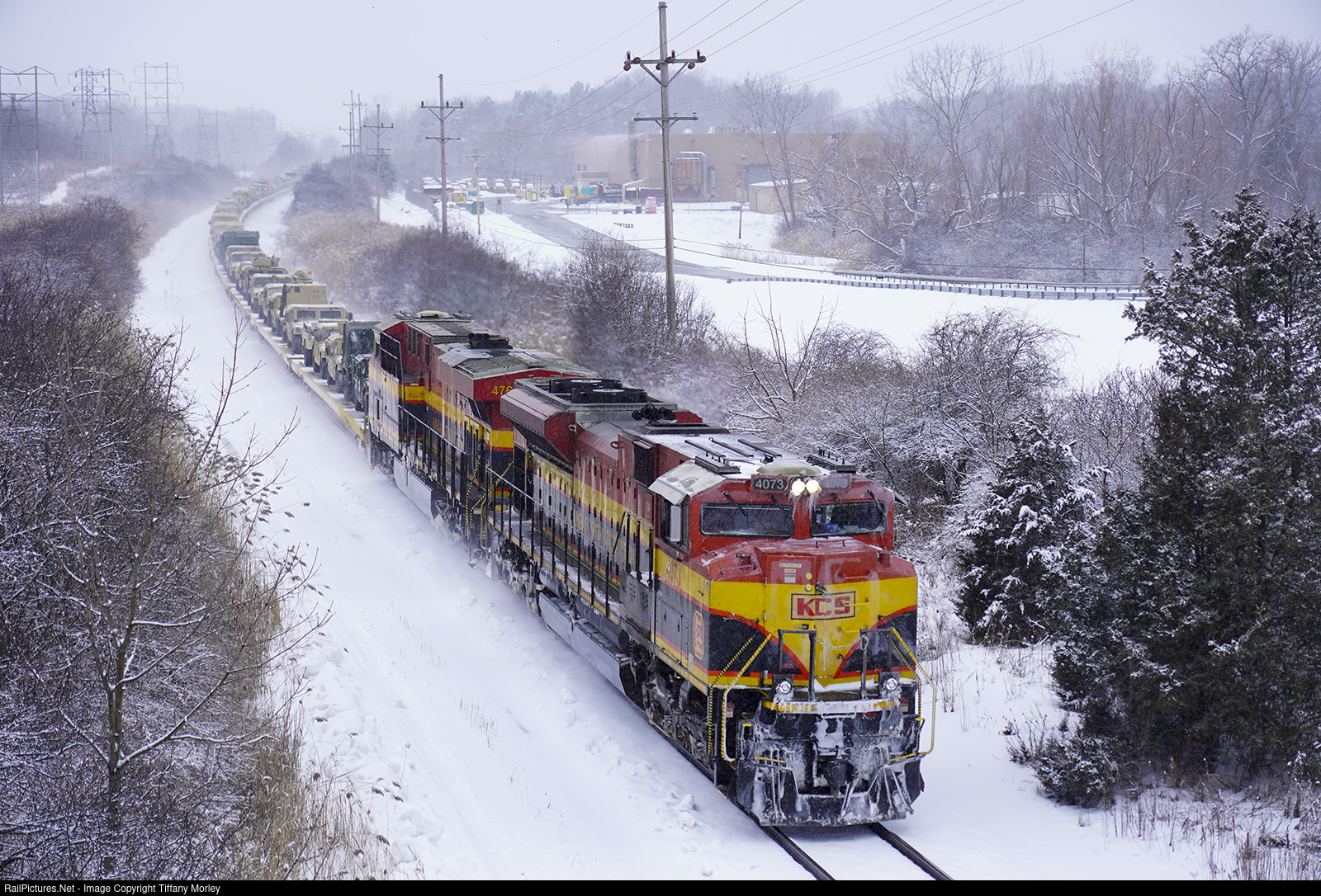 The CSX W81031 Eastbound military equipment move (Rose Lake, IL (KCS) - Fort Drum, NY) traverses Upstate New York during a snow storm.