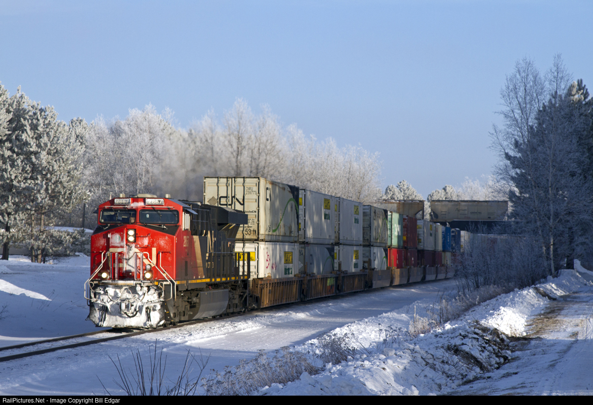 CN 2867 has a northbound stack train moving well through Munger, MN on former DM&IR trackage, passing under a southbound freight on former DWP trackage. Typical practice between Duluth and Virginia, MN is for northbound CN trains to use the DM&IR trackage, which also sees bi-directional ore and limestone traffic, while using the DWP line for southbound trains. They join together at Nopeming Jct. on the south and again at Virginia. This is the only location in between where both lines are visible together.