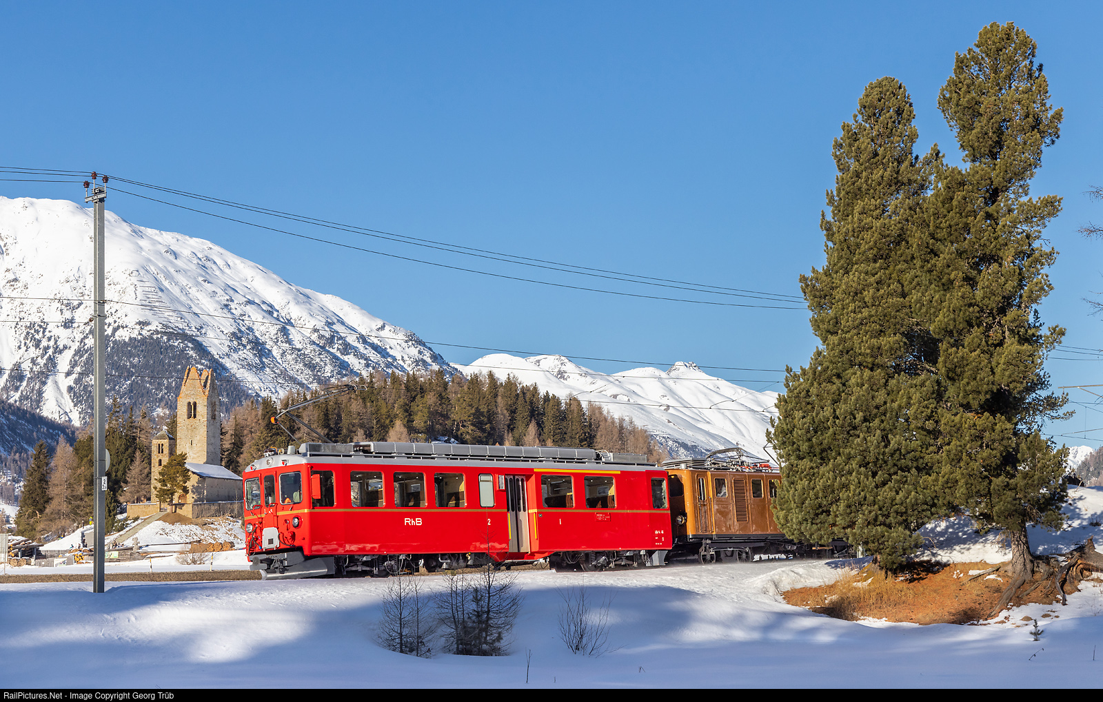 Railcar ABe 4/4 # 46 (1965) of the Rhaetian Railway is pulling the locomotive Ge 4/4 # 81 of the Blonay-Chamby Railroad Museum near Celerina Staz, on a test run from Pontresina to St.Moritz. In the background the San Gian church from the 15th century. The Ge 4/4 # 81 was built in 1916 by SLM and BBC for the Bernina Railway (as Ge 6/6, rebuilt to Ge 4/4 in 1929), is owned and operated by the Blonay-Chamby Railroad Museum, but guest on the Bernina line in 2021/2022.
