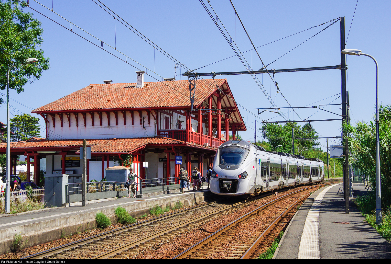 | A SNCF Regiolis pauses briefly at the beautiful station of Hendaye Gare des Deux-Jumeaux, located on the Atlantic Ocean near the Spanish border. The station is names after a nearby rock formation at the northern end of the beach of Hendaye. |
