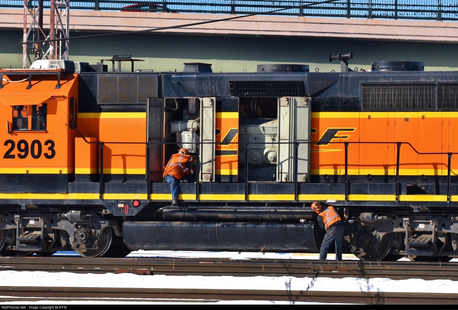 Two BNSF workers do light maintenance on BNSF 2903 (GP39-3) while it sits in the Denver Yard.