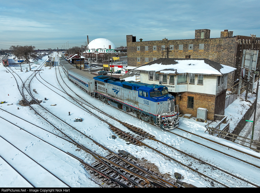 | Winter is always a rough time for the Amtrak Charger units. With a number of them suffering failures, P32BWH #500 got a chance to lead numerous Hiawathas between Chicago and Milwaukee. Train #333 is seen making its way out of the city, passing Tower A2. |