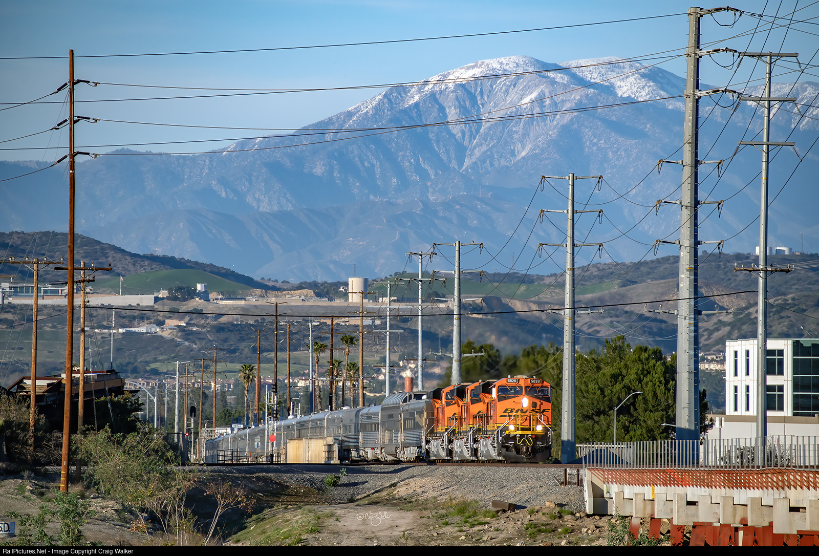 The San Gabriel Mountain Range's 10,069 ft (3,069 m) high Mt. San Antonio (also commonly known as "Mt. Baldy") looms over southern California's urban landscape as BNSF Railway train O-BARSDG1-05A, a deadheading 16-car Officer Special, crosses over the Santa Ana River on Metrolink’s Olive Sub as the train makes its way late in the afternoon from Barstow to San Diego. A trio of the Railway's 25th Anniversary engines – 5828, 6017 and 6163 – are powering this train. (Anaheim, California – February 5, 2022). The schedule for this train's run on Sunday (2/13/22) is that the train will depart San Diego at 7:00 am, and is due to arrive at Commerce (a bit southeast of downtown Los Angeles) at 10:00 am.