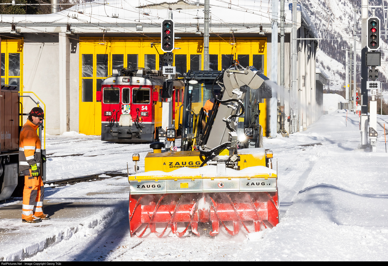 Railcar ABe 4/4 # 54 of the Rhaetian Railway is standing in front of the shed in Pontresina. The stub track is beeing cleared from snow with a road snow blower of Zaugg.