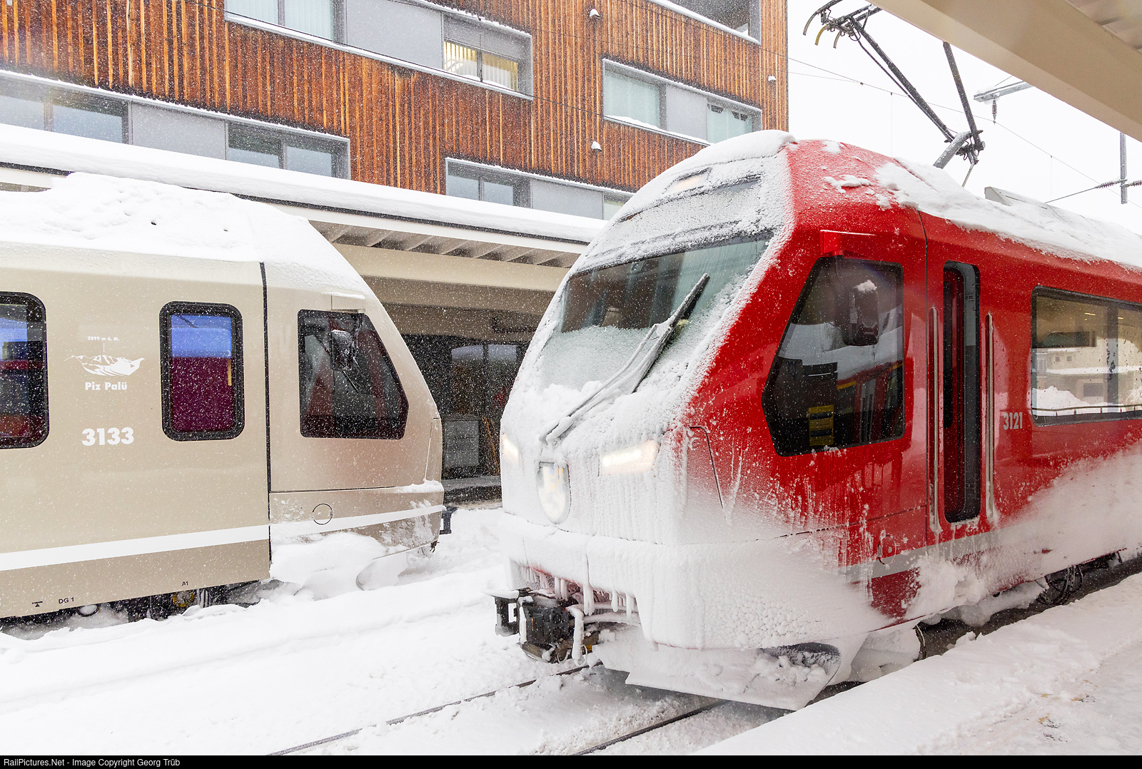 | "Capricorn" trains ABe 4/16 # 3133 "Piz Ela" (unique in the Champagne color) and # 3121 of the Rhaetian Railway in Davos Platz. The # 3121 arrived from Filisur some minutes before and will run back soon. |