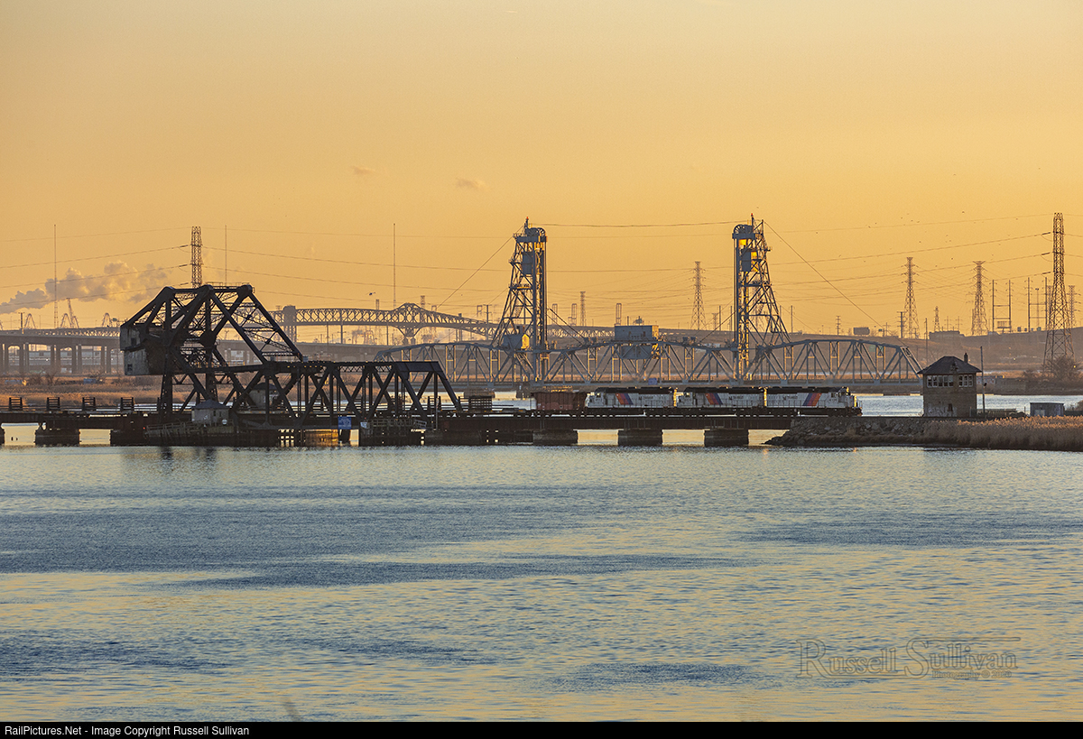 A day of dropping welded rail on the Bergen County Line comes to an end as X4105 shoves across HX bridge to tie down for the night.