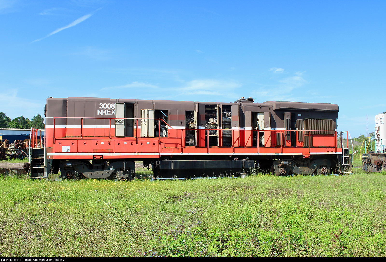 | The doors are open on ex Providence and Worcester b-unit as it sits in the former NRE storage facility in Waycross, Georgia. This locomotive has long since been removed from the property. Photo taken with permission. |