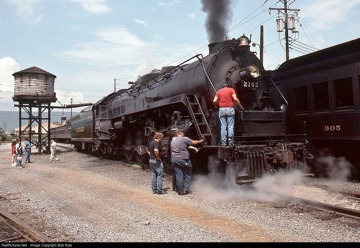 30-plus years ago, Reading T-1 No. 2102 is getting some attention from the crew, who seem to be adjusting an air compressor. Ahead is a day of pulling excursion trains between South Hamburg and Temple on the old Blue Mountain and Reading tourist line.