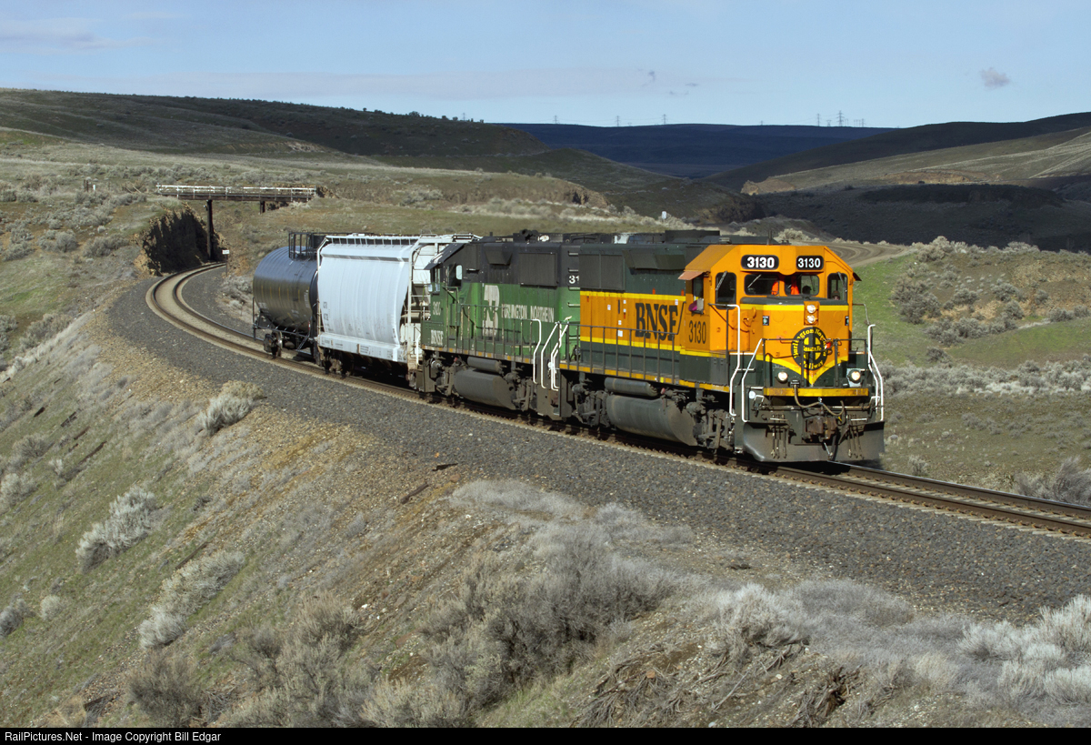 BNSF 3130 and 3120, both GP50s, lead a westbound Quincy Local into Trinidad, WA at MP 1625 on its return from Quincy, WA to Wenatchee's Appleyard. The train operates weekdays as a turn originating in Appleyard and occasionally may run as far east as Ephrata, WA.