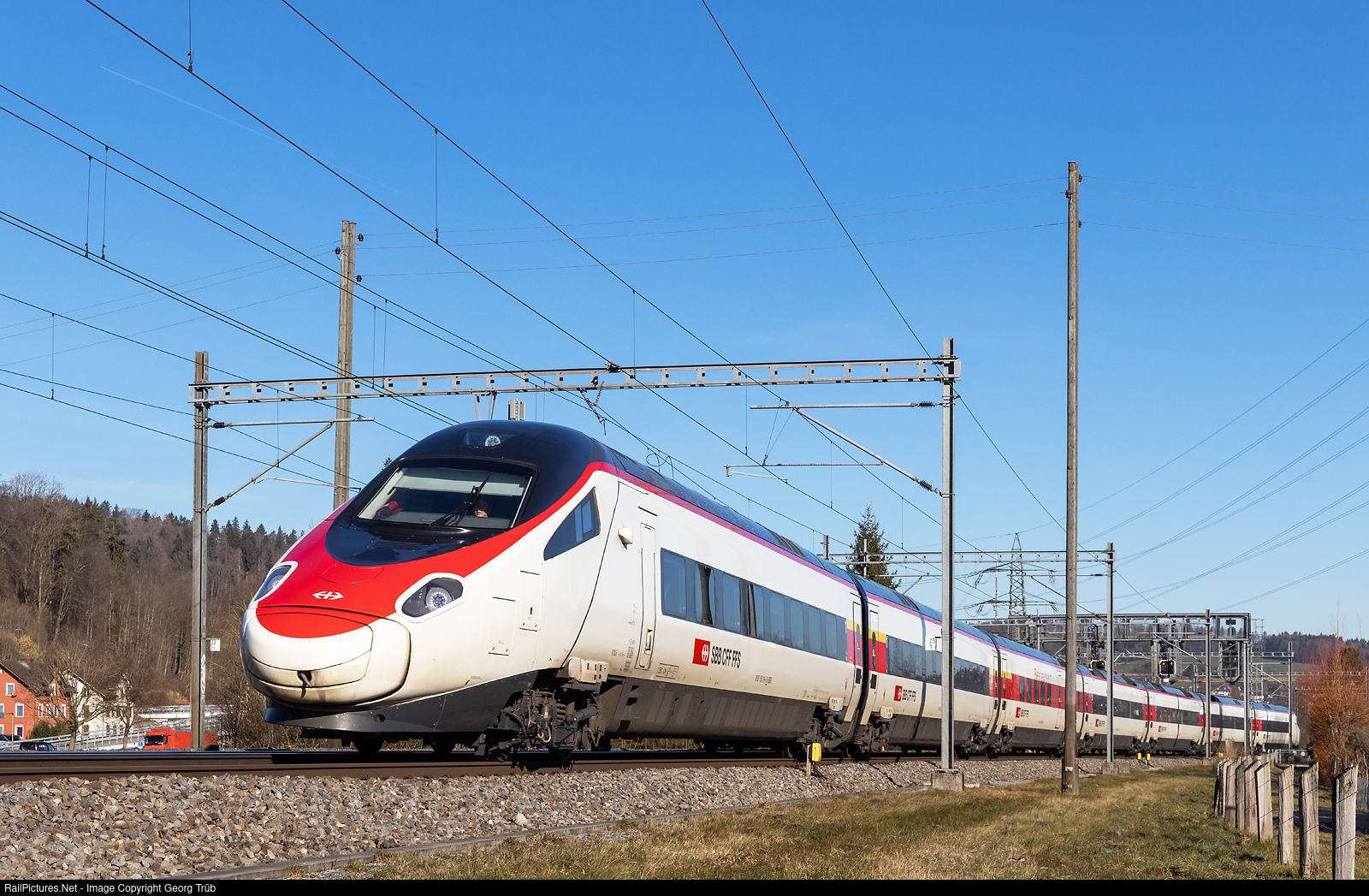 | Highspeed tilting train RABe 503 # 014 of the SBB is running the 10 minutes late Eurocity 198 from München via Lindau Reutin-Bregenz to Zürich through Winterthur Tössmühle. |