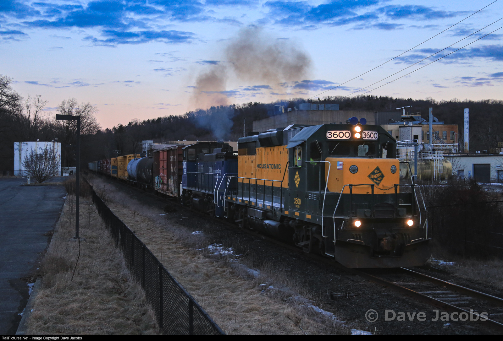 A rare evening train on the south end of the Berkshire line heads north passing the former Nestle plant in the Boardman's Bridge section of New Milford. The train picked up 17 cars, and trailing the 3600 is leased GMTX MP15DC #229.