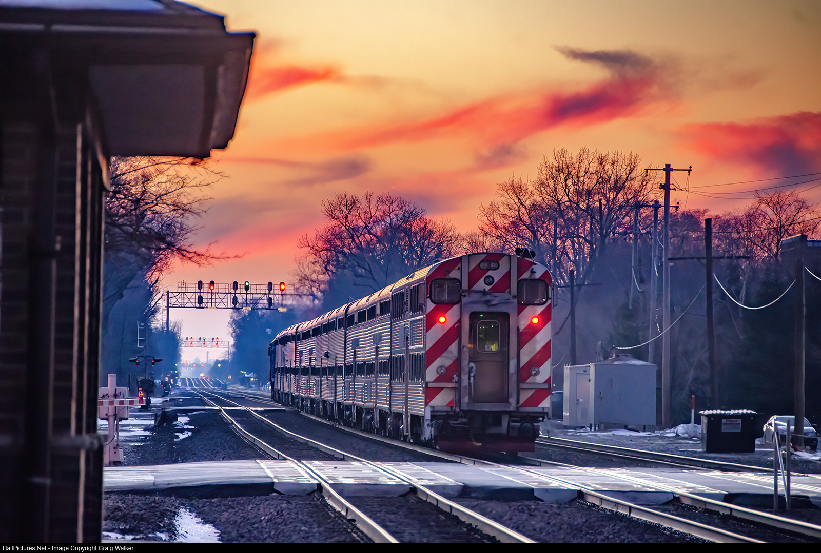 Literally heading into the sunset is Metra train 1251, led by F40PHM-2 213, ferrying weary commuters from downtown Chicago to, ultimately, the western suburb of Aurora. (Berwyn, Illinois – January 14, 2016)