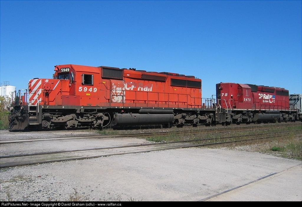 | CP 5949, CP 5478 lead a train out of Toronto toward London. 5478 is a high-nose SD40-2 with boarded cabs, one of few CP ever had. Last I heard this unit was in storage... CP seems to be pulling every old engine they have out of the garbage to use. |