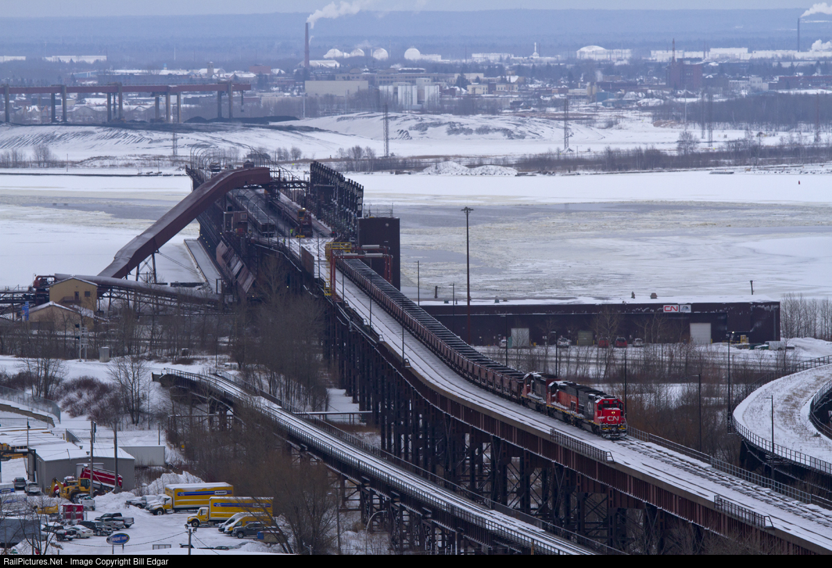 DMIR 406 pulls empty ore cars from the CN ore dock located in the Duluth harbor. The dock is the last operable one in Duluth. Under the dock is trackage used by CN, CP, BNSF and UP to access Duluth's harbor. In the lower foreground, a single track trestle connects CN to the waterfront. Across the waterway is the Midwest Energy Center coal unloading facility in Superior, WI, used by BNSF and UP for transfer of coal the lake boats.