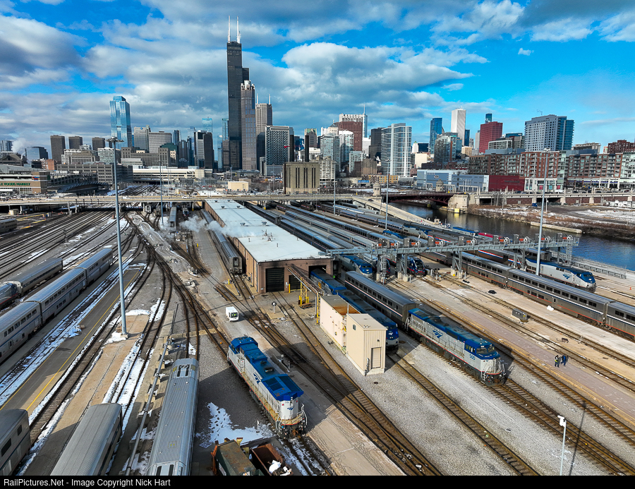 As multiple Amtrak train sets await servicing and or departures out of the city, Dash 8 #500 shuffles Superliners around the 14th Street Coach Yard. #519 can also be seen in the foreground patiently awaiting its next assignment. After a week's long assignment of running Hiawatha trains between Milwaukee and Chicago for 500, it's back to the usual yard work grind for the classic P32BWH.