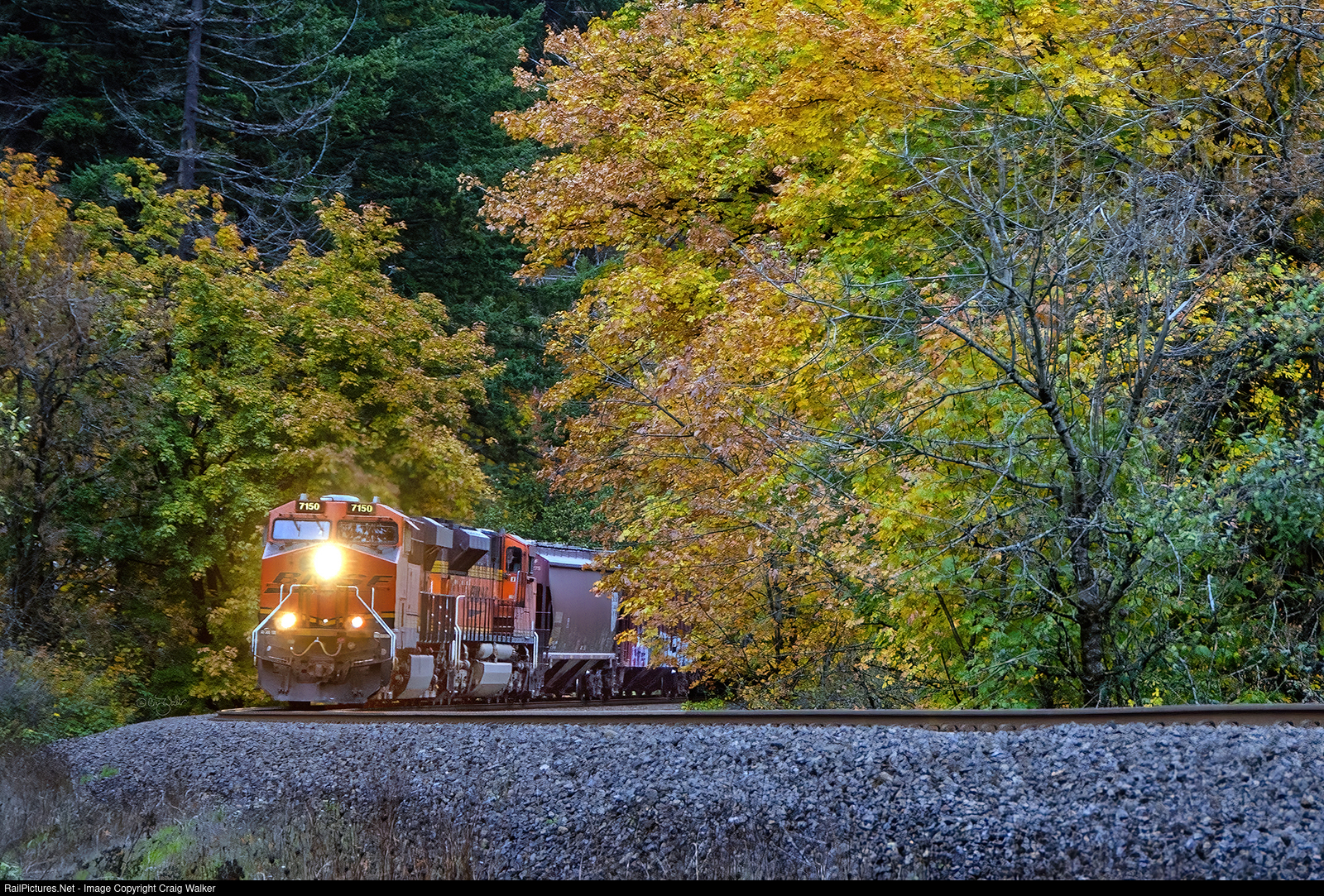 Almost blending in with the autumn colors is BNSF Railway train G-CEGLVN9-22, passing through Skamania, Washington, on October 25, 2019. This train, carrying grain from Chester, Montana, to Longview, Washington, is led by ES44C4 7150 and SD70ACe 8533 – which has a "tiger stripe" look as it appears someone with time to kill selectively cleaned road grime off the engine to create the stripe pattern (which is on both sides and both ends of the locomotive). BNSF Dash 9-44CW 4616 is this train's rear DPU.