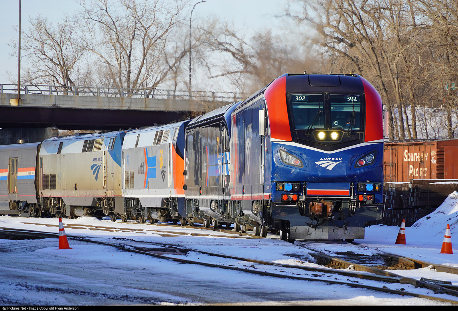 AMTK 302 followed by two 50th anniversary units and a phase 5 P42 lead the eastbound Empire Builder through St. Paul Midway, running over 9 hours late.