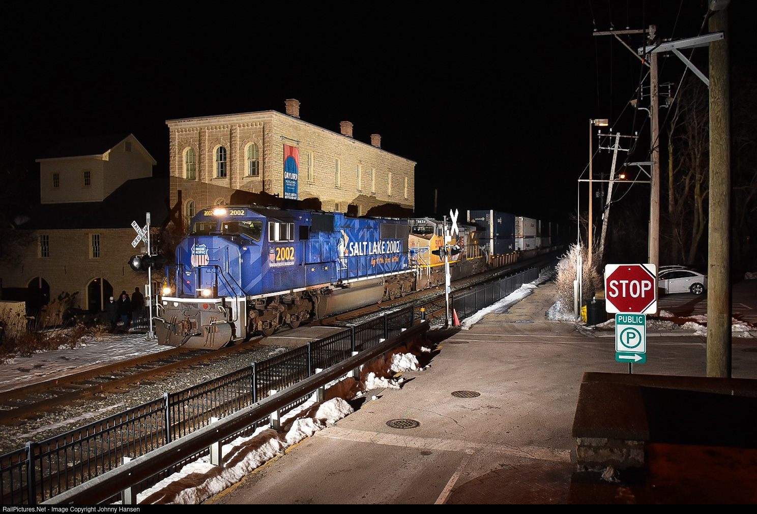| Union Pacific’s Winter Olympics SD70M #2002 has been in and out of the Chicagoland region as of lately on stack trains. On the evening of Valentine’s Day ‘22, UP 2002 and another GE split the broken pedestrian railroad crossing on 8th Street leading CSX Q191 (ICOG4 the UP symbol) past the historic Gaylord Building in Lockport on the final mileage upon arrival to Global IV Yard. |