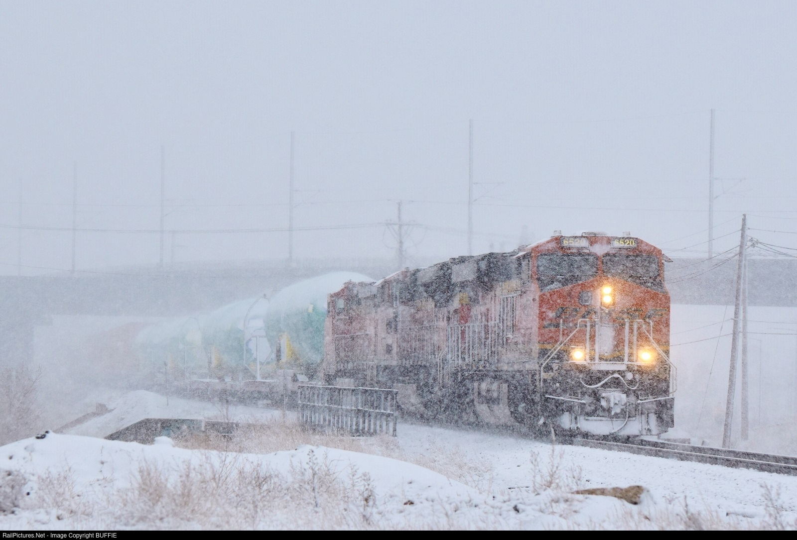 Heavy snow is falling as BNSF 5620 (ES44AC) leads a Boeing train east on the Brush Sub.