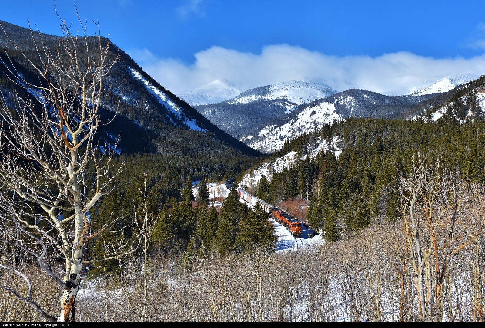 | The sun shines on the valley between the east portal of the Moffat Tunnel and Tolland, Colorado, as BNSF 8207 (ES44C4) brings a long freight down the winding Moffat Tunnel Sub. |