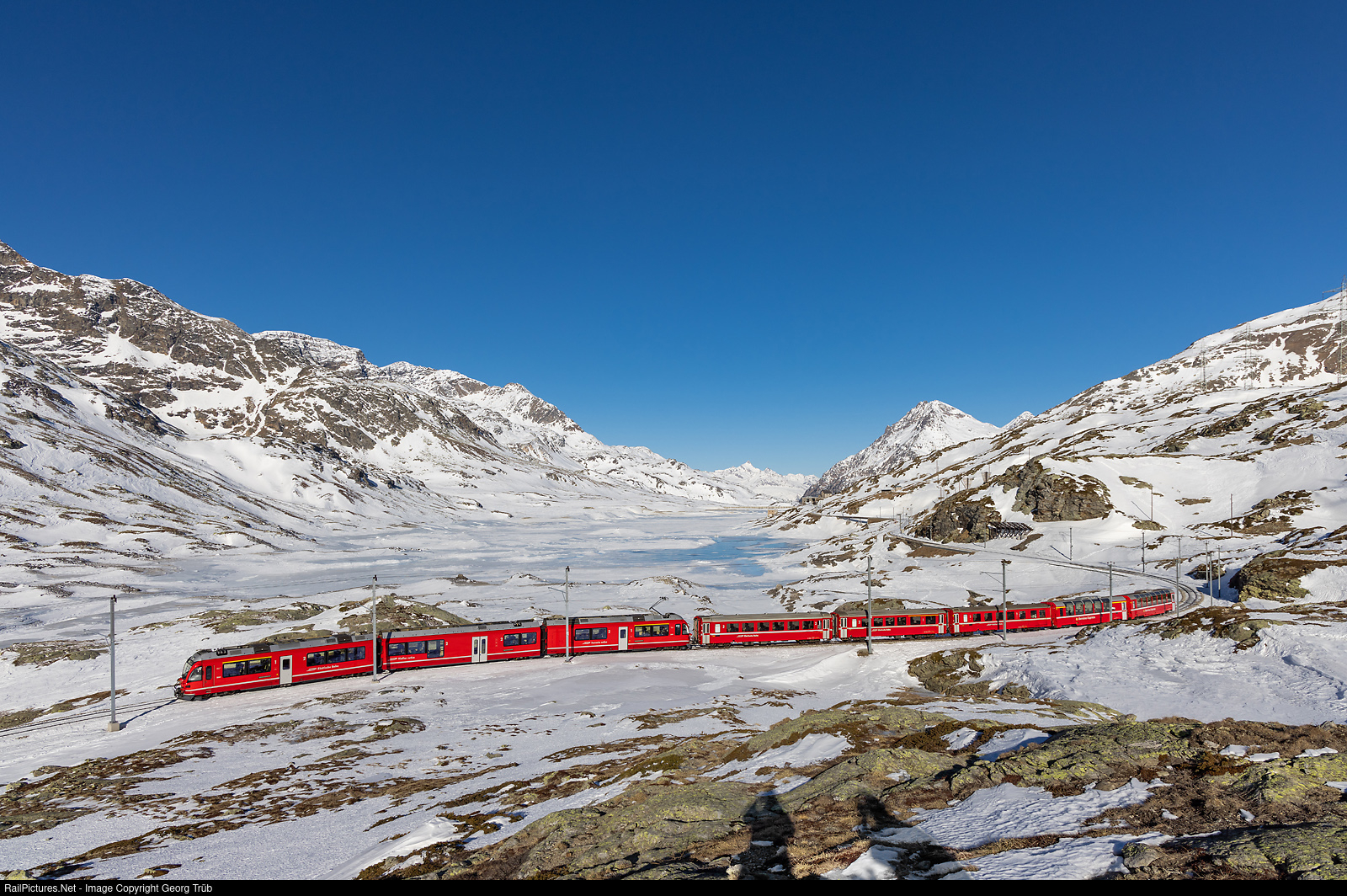 | "Allegra" ABe 8/12 # 3501 of the Rhaetian Railway is pulling regional train 1617 from St.Moritz over the Bernina pass to Tirano, running along the frozen and lowered Lago Bianco (White Lake) on about 2250 meter a.s.l. There is very few snow on the pass this winter! In the rear of the train two BERNINA EXPRESS panorama cars, surplus in this time of the year and coupled to regional trains, to use with a supplement of 5 swiss francs. |
