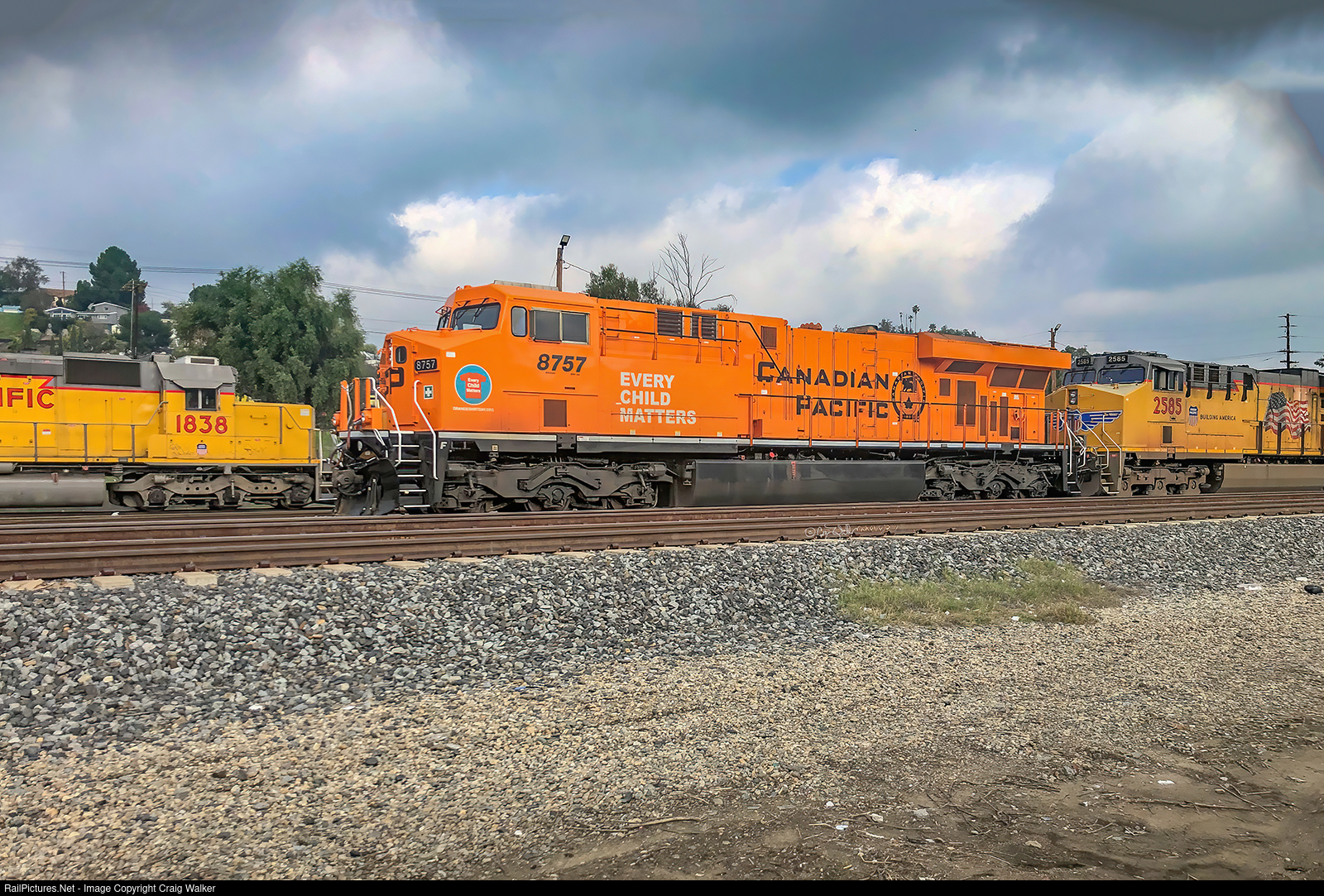 Canadian Pacific ES44AC 8757 has been painted in an orange livery that bears the motto "Every Child Matters" in order to celebrate the new holiday National Day for Truth and Reconciliation, which honors the lost children and survivors of Indian Residential Schools, their families and communities, and coincides with Orange Shirt Day, an Indigenous-led day of remembrance. The special livery was proposed by Jacob Hoffer, a 13-year-old Indigenous youth, who over the summer wrote to the railway asking it to paint a locomotive orange. Jacob and his mother, Darcy, participated in the unveiling of the locomotive at CP headquarters in Calgary on September 29, 2021, with the engine entering service on September 30, 2021 – the first National Day for Truth and Reconciliation.