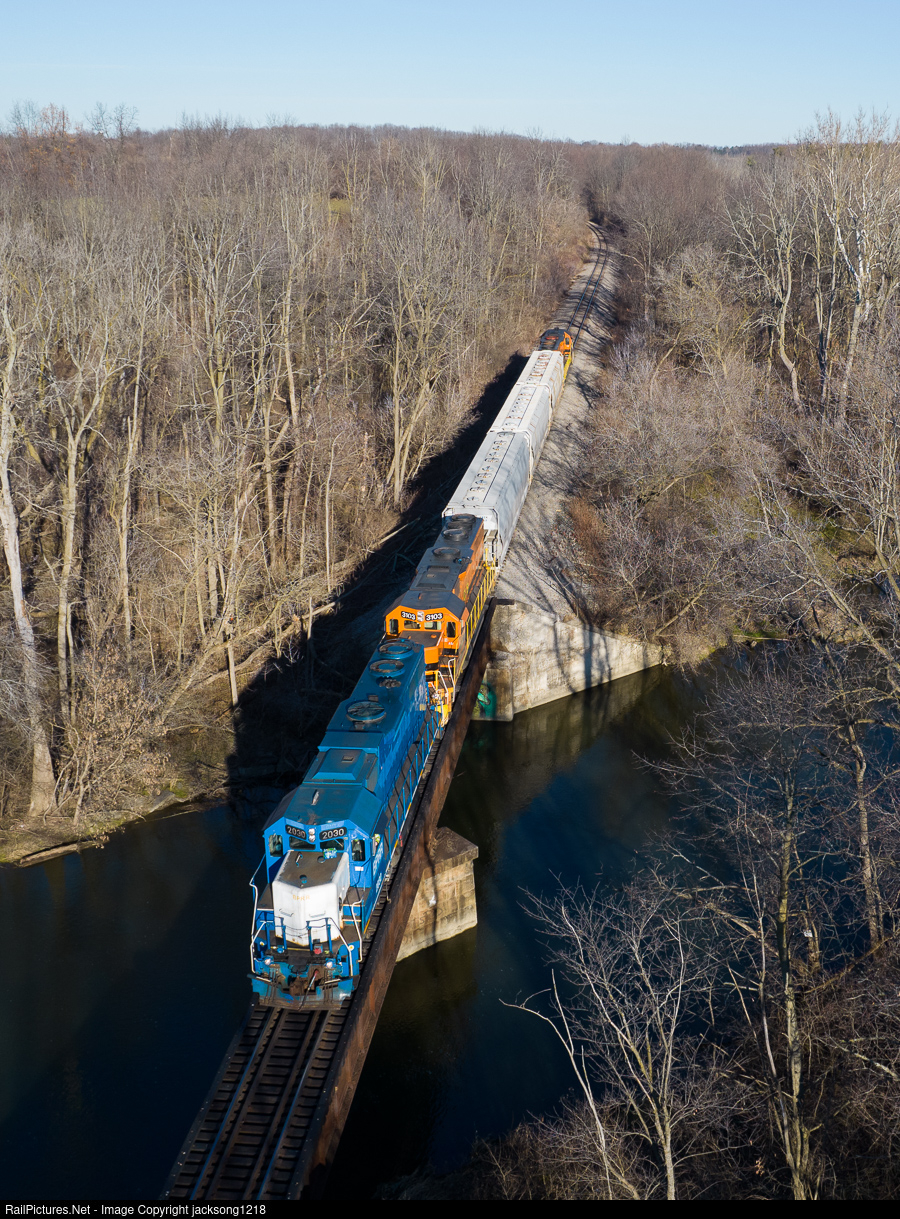 Rochester & Southern train BL-1 passes over the Oatka Creek in Wheatland Center with a trio of GPs. 3101 was running on the rear to facilitate an easier pickup at Retsof.