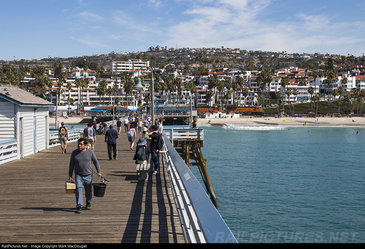 The head end of a unit windmill component train cuts through the San Clemente Pier on a nice February afternoon.