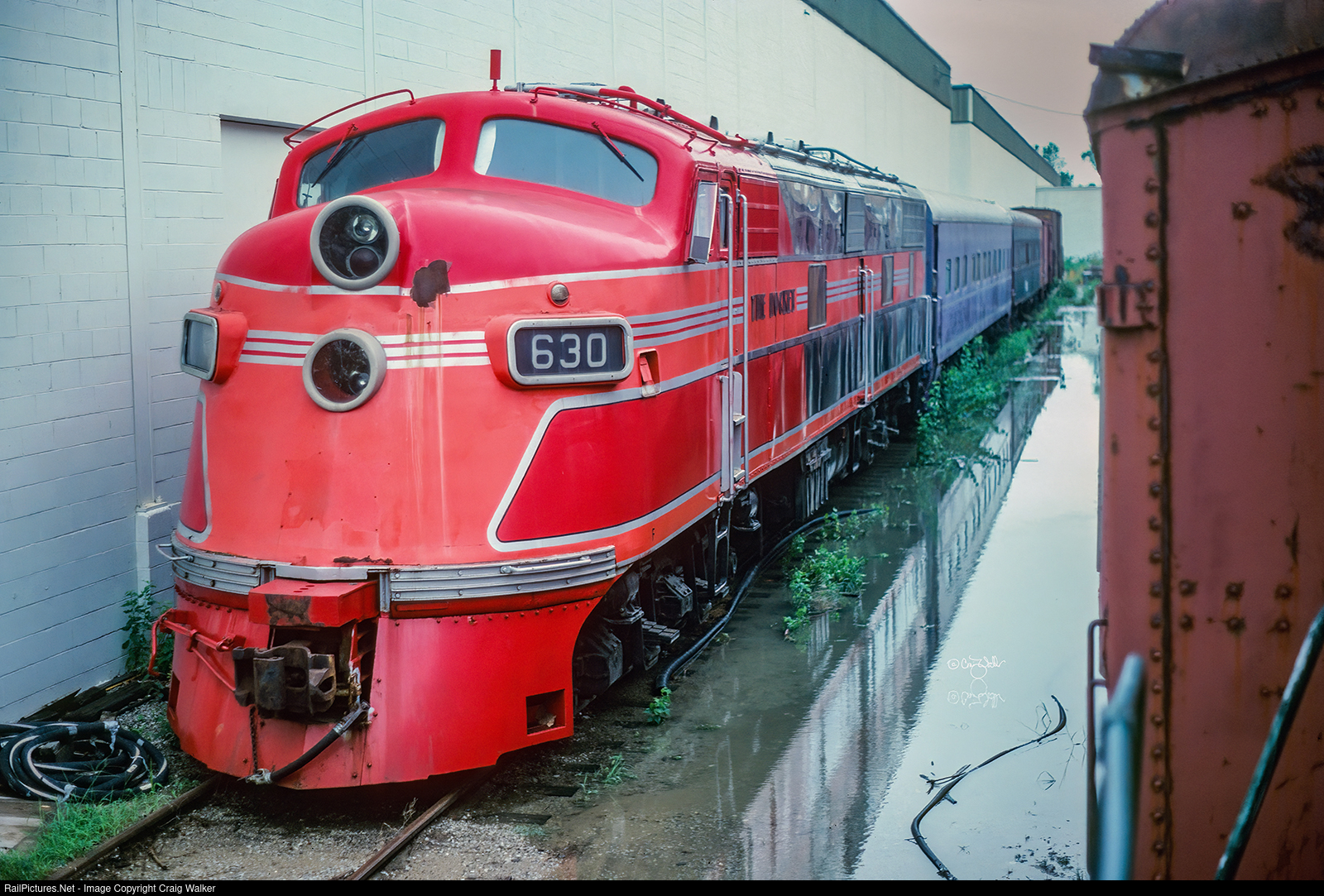 Built by General Motors Electro-Motive Division in October 1941, Chicago, Rock Island & Pacific Railroad E6A 630 was one of five E6As purchased by the railroad. The E6s earned their keep pulling the railroad’s passenger trains, such as the Rocky Mountain Rocket and _ for decades. One was wrecked and rebuilt into an E8A in 1953, another was retired in 1966 and two more were retired in 1969. But the 630 escaped the scrapper’s torch and was donated to the Kansas City Railway Museum (cut-and-paste this address: https://en-academic.com/dic.nsf/enwiki/10351345) in May 1979. It then ended up on the Midland Railway, in Baldwin City, Kansas. RI 630 has since been sold and will become part of a future museum in Manly, Iowa, along with Rock Island E8A 652. Both units have been cosmetically restored but currently are under a mechanical restoration at Mid-America Car in Kansas City, MO as of March 2017. (Kansas City, Missouri – July 27, 1998)